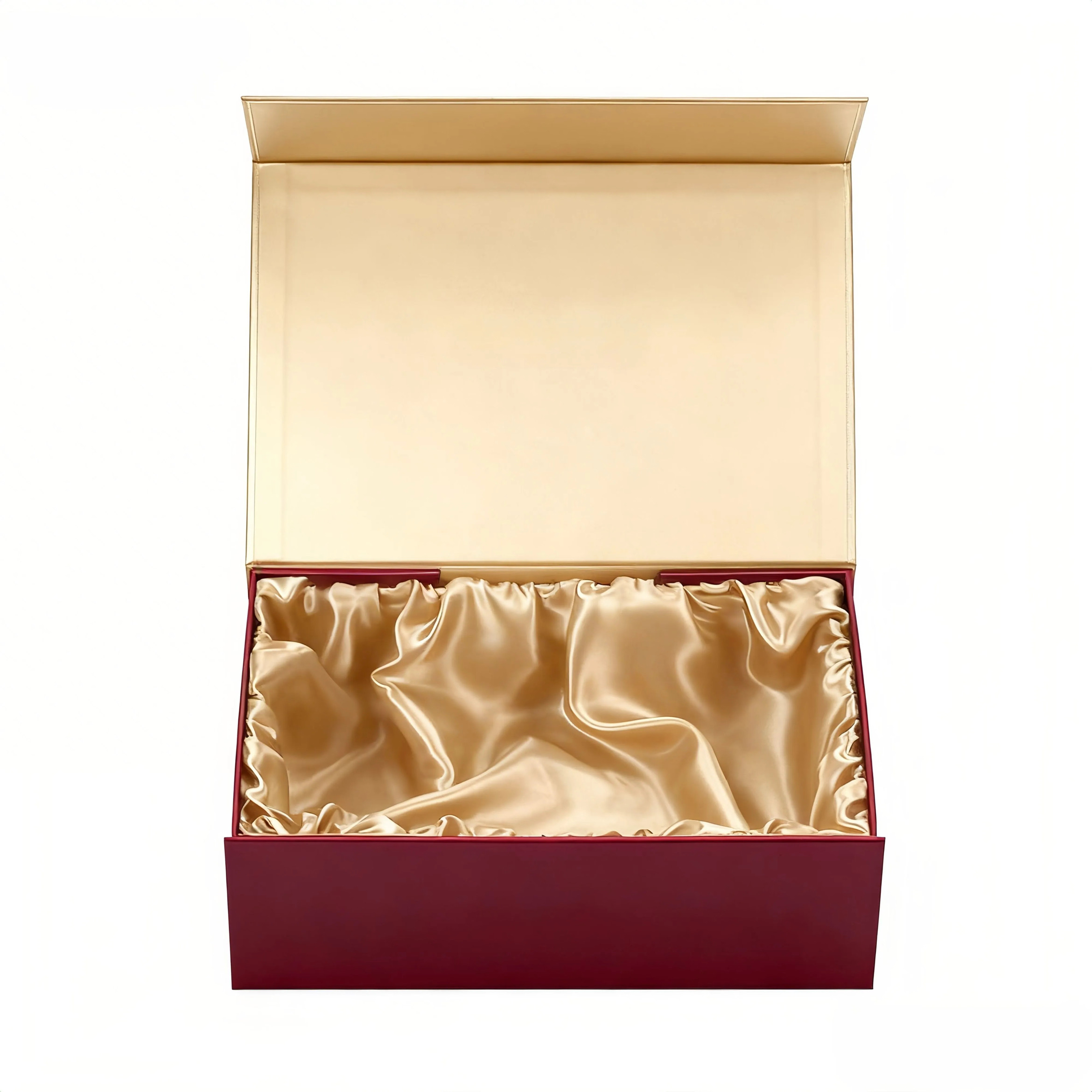 Burgundy box, champagne satin, gold foil — packaging that matches the value you paid for.