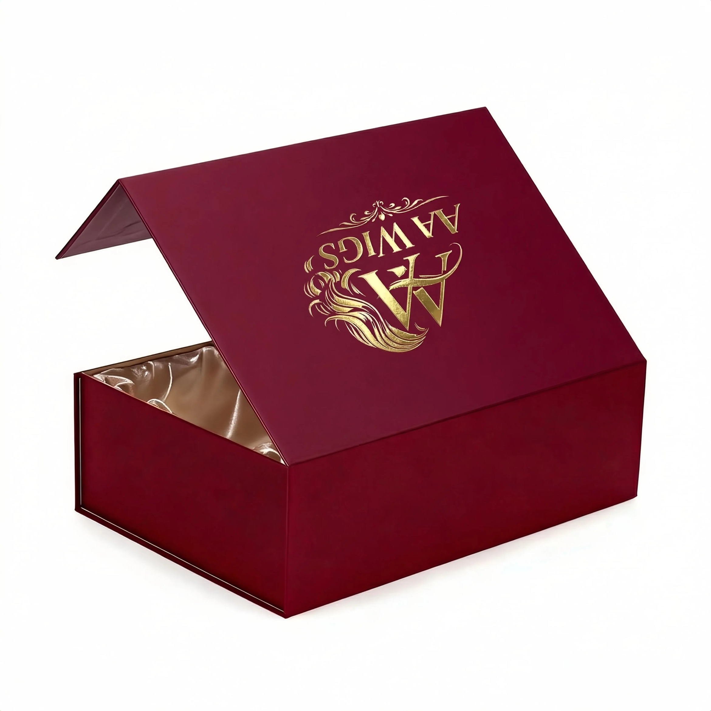 Your crown arrives in a burgundy luxury box with gold foil logo and champagne satin interior. Built to feel premium the moment it's opened — because your hair is an investment.